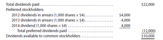 The corporation was organized on January 1, 2012, and paid no dividends in 2012 and 2013. In 2014, the corporation paid $22,000 in dividends, of which $12,000 was paid to preferred stockholders and $10,000 was paid to common stockholders as shown below.