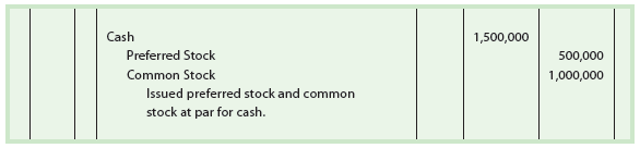 A separate account is used for recording the amount of each class of stock issued to investors in a corporation. For example, assume that a corporation is authorized to issue 10,000 shares of $100 par preferred stock and 100,000 shares of $20 par common stock. The corporation issued 5,000 shares of preferred stock and 50,000 shares of common stock at par for cash. The corporation’s entry to record the stock issue is as follows: