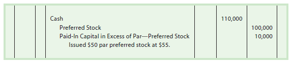 To illustrate, assume that Caldwell Company issues 2,000 shares of $50 par preferred stock for cash at $55. The entry to record this transaction is as follows: