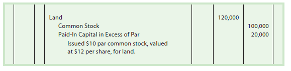 To illustrate, assume that a corporation acquired land with a fair market value that cannot be determined. In exchange, the corporation issued 10,000 shares of its $10 par common stock. If the stock has a market price of $12 per share, the transaction is recorded as follows: