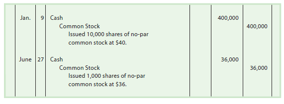 To illustrate, assume that on January 9 a corporation issues 10,000 shares of no-par common stock at $40 a share. On June 27, the corporation issues an additional 1,000 shares at $36. The entries to record these issuances of the no-par stock are as follows: