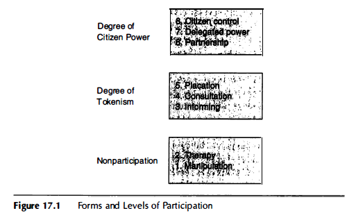 A valuable contribution of Arnstein’s analysis is to treat participation broadly by including everything from manipulation to citizen control and then to differentiate the effects on power relationships. For example, people can be said to participate in manipulative situations but, from the point of view of power, they are nonparticipants in the social outcomes created. Whatever else it does, this typology makes it clear that participation is not always a virtue.