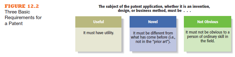 There are three types of patents: utility patents, design patents, and plant pat- ents. As shown in Figure 12.2, there are three basic requirements for a patent to be granted: The subject of the patent application must be (1) useful, (2) novel in relation to prior arts in the field, and (3) not obvious to a person of ordinary skill in the field.