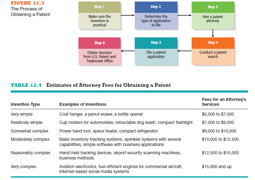Obtaining a patent is a six-step process, as illustrated in Figure 12.3 and as we discuss here. The costs involved include attorney fees, fees for drawings (which are sometimes lumped together with the attorney fees), and USPTO filing and maintenance fees. For a small entity, it costs around $700 to file a utility pat- ent application. An additional $480 fee is assessed when a patent is issued. Maintenance fees of $800, $1,800, and $3,700 are due at the 3 ½ year mark, the 7 ½ year mark, and the 11 ½ year mark, respectively, to keep a patent in force. Additional fees may be assessed depending on the nature of the patent. Attorney fees vary depending on the complexity of the technology involved. An estimate of attorney fees to obtain a patent is provided in Table 12.4.