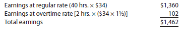 To illustrate computing an employee’s earnings, assume that John T. McGrath is a salesperson employed by McDermott Supply Co. McGrath’s regular rate is $34 per hour, and any hours worked in excess of 40 hours per week are paid at 1% times the regular rate. McGrath worked 42 hours for the week ended December 27. His earnings of $1,462 for the week are computed as follows: