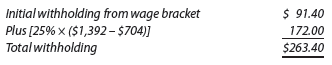 For McGrath’s wage bracket, the withholding is computed as “$91.40plus 25% of the excess over $704.” Hence, McGrath’s withholding is $263.40, as shown below.