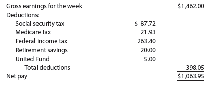 Gross earnings less payroll deductions equals net pay, sometimes called take-home pay. Assuming that John T. McGrath authorized deductions for retirement savings and for a United Fund contribution, McGrath’s net pay for the week ended December 27 is $1,063.95, as shown below.