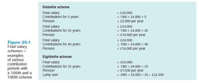 - Defined benefit schemes dominated for the past thirty or forty years, but the number of people with access to them has declined hugely in the last four or five years. Virtually all the public sector schemes still take this form, but two-thirds of the private sector schemes have now been closed to new members (NAPF 2007). They remain operational only for the purposes of paying pensions to retired members and for the benefit of employees who joined before their closure. Here contributions are made into a single organisation-wide fund which is invested on behalf of members by a fund manager. Retired employees then draw a pension from the fund calculated according to a defined formula. Most defined benefit schemes take the final salary form, in which the value of the pension is determined by the level of salary being received by each individual at the time of retirement. In the private sector it is common for this to be calculated on a ‘sixtieths’ basis, whereby the retiree is paid an annual pension equivalent to 1/60th (1.67 per cent) of his or her final salary multiplied by the number of years’ pensionable service he or she has completed. In the public sector it is usual for the figure to be based on ‘eightieths’, with a tax-free lump sum being paid in addition at the time of retirement. In either case the size of pension is heavily related to the length of scheme membership, the maximum pension payable equalling two- thirds of final salary. Examples of final salary calculations are given in Figure 29.1.