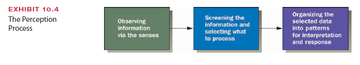 Another critical aspect of understanding behavior is perception. Perception is the cogni- tive process people use to make sense out of the environment by selecting, organizing, and interpreting information from the environment. Attitudes affect perceptions, and vice versa. For example, a person might have developed the attitude that managers are insensitive and arrogant, based on a pattern of perceiving arrogant and insensitive behavior from managers over a period of time. If the person moves to a new job, this attitude will continue to affect the way this person perceives superiors in the new environment, even though managers in the new workplace might take great pains to understand and respond to employees’ needs.
