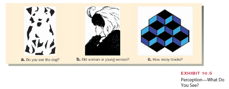 We can think of perception as a step-by-step process, as shown in Exhibit 10.4. First, we observe information (sensory data) from the environment through our senses: taste, smell, hearing, sight, and touch. Next, our mind screens the data and selects only the items we will process further. Third, we organize the selected data into meaningful patterns for interpretation and response. Most differences in perception among people at work are re- lated to how they select and organize sensory data. You can experience differences in per- ceptual organization by looking at the visuals in Exhibit 10.5. What do you see in part a of Exhibit 10.5? Most people see this as a dog, but others see only a series of unrelated ink- blots. Some people will see the figure in part b as a beautiful young woman, whereas others will see an old one. Now look at part c. How many blocks do you see—six or seven? Some people have to turn the figure upside down before they can see seven blocks. These visuals illustrate how complex perception is. Perception has a lot to do with how we view work- place interactions. Someone with a large ego will expect special treatment and would tend to see equal treatment as more-or-less unfair.
