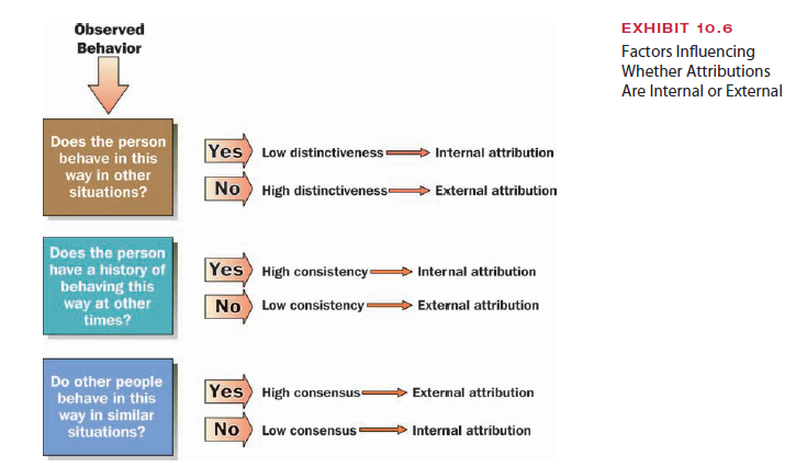 Social scientists have studied the attributions people make and identified three factors that influence whether an attribution will be external or internal.22 These three factors are illustrated in Exhibit 10.6.