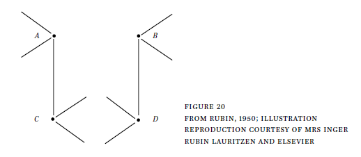 Rubin puts forth the case of a straight line whose middle point is marked. If one angular sector of the Muller-Lyer device is joined to the middle point, this point no longer appears to divide the line into two parts that appear equal. This point is seen to be the same as before, when it did visually divide the line into two equal halves, and it is known to be by definition something that lies at the middle of the line; however, this is not visually the case. To satisfy visually the geometrical definition, the point should be laterally displaced. In order to emphasize the meaning of such observations, Rubin presents three lines simultaneously to subjects. The first is a straight line with a marked middle point. The second is the same line with an angular sector joined to the middle point. The third is the same straight line with the angular sector, whose marked middle point is displaced laterally on the right or the left according to the acute or obtuse angle of the joined sector. Rubin reports that subjects agree in seeing the straight line with the angular sector and the displaced middle point as “the same” as the first line. He then claims that for this to make sense, one should conclude that this third line appears as the equivalent inside the Muller-Lyer device of the first line, which is divided into two metrically and visually equal segments.