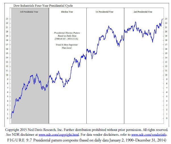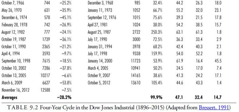 Almost all cycles are measured from bottom to bottom. Tops fail to occur as regularly, but, of course, their average interval is also four years (see Table 9.2). Some analysts have argued that because the U.S. Presidential elections are also four years apart, the cycle is due to the election cycle (see the next section, “Election Year Pattern”). It is, thus, often called the “Presidential cycle.” However, this cycle also occurs in countries that do not have four-year elections, such as Great Britain. It may be that U.S. economic strength is so huge and so globally powerful that other countries are forced to follow its stock market cycles, or it may be that the 40- month (almost four years) economic cycle Wesley Mitchell discovered 80 years ago is still dominant but has been slightly stretched by economic and the Federal Reserve policy action. Whatever the reason for its existence, the four-year cycle is obviously a very strong, important, and reliable cycle.