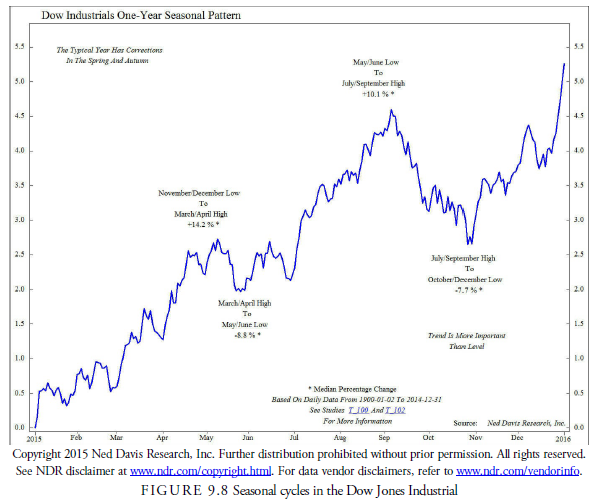 A seasonal pattern in agricultural prices has been known for centuries. More recently, interest rates have followed a seasonal pattern as money was borrowed for seed and returned when the crops were gathered. It turns out that seasonality exists in almost all economic statistics, and most producers of economic statistics, such as the Treasury, Federal Reserve, National Bureau of Economic Research, The Conference Board, and many others, adjust their numbers for seasonality. Technical analysts sometimes frown upon this practice because it distorts real figures with adjusted figures. However, it is an admission that seasonality is an important factor in economic statistics and that the earth’s tilt and travel around its orbit have a substantial effect on prices, markets, and economic activity.