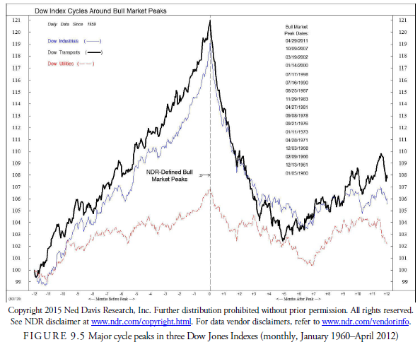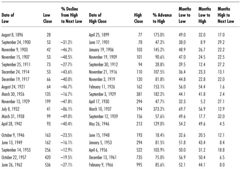 As Figure 9.5 shows, when the stock market peaks and declines, the earlier rise and subsequent decline are quick and steep, with advances averaging 12 months, but often lasting much longer, and declines averaging only 6 months. These devastating declines are the reason for the study of market timing. Market timing would save a lot of agony if it was successful. At first market technicians looked at the periodicity of market peaks because they were generally easy to define. And in doing so, they found the interesting phenomena is that while the peaks don’t show any cyclicality, the bottoms do. Bottoms tend to occur every four years with a reasonable statistical variance.