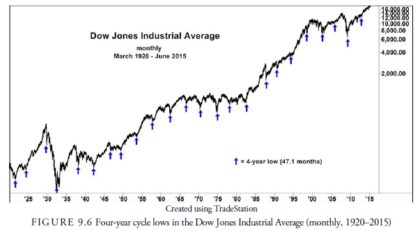 Today, the four-year cycle, from price bottom to price bottom, is the most widely accepted and most easily recognized cycle in the stock market. Occasionally it strays from four years, but only by a portion of a year (see Figure 9.6). This is a remarkably consistent series.
