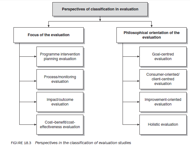 whether or not the programme has achieved its intended objective. If the evaluation is from the focus perspective, it is classified as an impact/outcome evaluation, and if the focus is from the philosophical perspective, it is also classified as a goal-centred evaluation. Again, if you determine the impact of a programme/intervention by asking what clients/consumers perceive its effects to have been on them, this is also classified as a client-centred evaluation from a philosophical perspective. If you examine every aspect of a programme with regard to its outcome, process and any other aspect, this is categorised as a holistic evaluation. Finally, every type of evaluation, process or outcome can be classified as an improvement-oriented evaluation from the philosophical perspective as the ultimate aim of any evaluation is to improve an intervention/programme. To avoid confusion between the two perspectives, an integrated picture is provided in Figure 18.3.