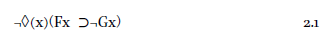 where F and G stand for features like color and surface, boundary and figure, good continuation and launch effect, pitch proximity and melodic figure or tonal quality and fusion. This means that a color appearance necessarily brings about the need for a surface and the demand for the latter to be filled by a color; or that a boundary-contour necessarily delimits something along one direction and a figure necessarily demands to be enclosed. The necessity regards the observable elements of the connection so that one could still conceive of a world in which a color does not need a surface or a figure is not enclosed by a boundary, but if this connection holds in perception it necessarily implies that the colors in the perceivable world must spread on surfaces and the boundaries must delimit asymmetrically an enclosed figure. Instead a de dicto property is expressed by the formula: