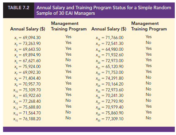 Now that we have described how to select a simple random sample, let us return to the EAI problem. A simple random sample of 30 managers and the corresponding data on annual salary and management training program participation are as shown in Table 7.2. The notation x1, x2, and so on is used to denote the annual salary of the first manager in the sample, the annual salary of the second manager in the sample, and so on. Participation in the management training program is indicated by Yes in the management training program column.