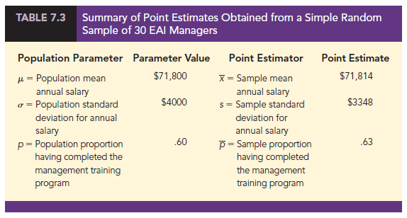 By making the preceding computations, we perform the statistical procedure called point estimation. We refer to the sample mean X as the point estimator of the population mean m, the sample standard deviation s as the point estimator of the population standard deviation s, and the sample proportion p as the point estimator of the population proportion p. The numerical value obtained for X, s, or p is called the point estimate. Thus, for the simple random sample of 30 EAI managers shown in Table 7.2, $71,814 is the point estimate of m, $3348 is the point estimate of s, and .63 is the point estimate of p. Table 7.3 summarizes the sample results and compares the point estimates to the actual values of the population parameters.