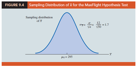 Because the sample size is large, the central limit theorem (see Chapter 7) allows us to conclude that the sampling distribution of X can be approximated by a normal distribution. Figure 9.4 shows the sampling distribution of X for the MaxFlight hypothesis test with a hypothesized population mean of m0 = 295.
