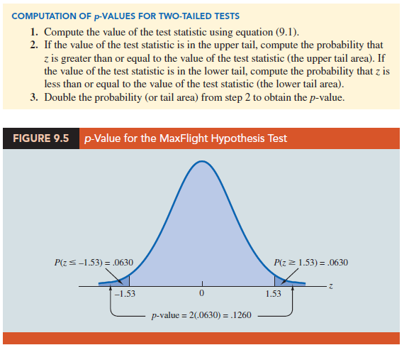 Now to compute the p-value we must find the probability of obtaining a value for the test statistic at least as unlikely as z = 1.53. Clearly values of z > 1.53 are at least as unlikely. But, because this is a two-tailed test, values of z < -1.53 are also at least as unlikely as the value of the test statistic provided by the sample. In Figure 9.5, we see that the two-tailed p-value in this case is given by P(z < -1.53) + P(z > 1.53). Because the normal curve is symmetric, we can compute this probability by finding the upper tail area at z = 1.53 and doubling it. The table for the standard normal distribution shows that P(z < 1.53) = .9370. Thus, the upper tail area is P(z > 1.53) = 1.0000 – .9370 = .0630. Doubling this, we find the p-value for the MaxFlight two-tailed hypothesis test is p-value = 2(.0630) = .1260.