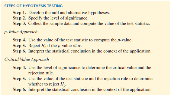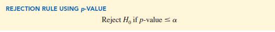 We can now state the general rule for determining whether the null hypothesis can be rejected when using the p-value approach. For a level of significance a, the rejection rule using the p-value approach is as follows: