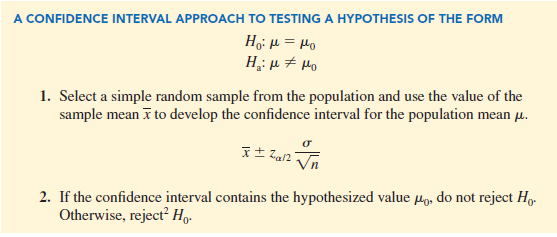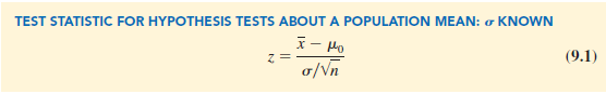 In Chapter 8 we said that the σ known case corresponds to applications in which historical data and/or other information are available that enable us to obtain a good estimate of the population standard deviation prior to sampling. In such cases the population standard deviation can, for all practical purposes, be considered known. In this section we show how to conduct a hypothesis test about a population mean for the σ known case.