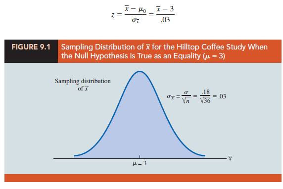 Test statistic For the Hilltop Coffee study, previous FTC tests show that the population standard deviation can be assumed known with a value of σ = .18. In addition, these tests also show that the population of filling weights can be assumed to have a normal distribution. From the study of sampling distributions in Chapter 7 we know that if the population from which we are sampling is normally distributed, the sampling distribution of X will also be normally distributed. Thus, for the Hilltop Coffee study, the sampling distribution of X is normally distributed. With a known value of σ = .18 and a sample size of n = 36, Figure 9.1 shows the sampling distribution of X when the null hypothesis is true as an equality; that is, when μ = μ0 = 3.[1] Note that the standard error of X is given by σX = σ/√n = .18/√36 = .03.