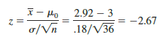Let us now compute the p-value for the Hilltop Coffee lower tail test. Suppose the sample of 36 Hilltop coffee cans provides a sample mean of X = 2.92 pounds. Is X = 2.92 small enough to cause us to reject H0? Because this is a lower tail test, the p-value is the area under the standard normal curve for values of z < the value of the test statistic. Using X = 2.92, σ = .18, and n = 36, we compute the value of the test statistic z.