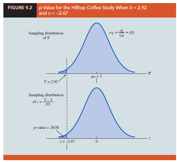 In the Hilltop Coffee test, the p-value of .0038 resulted in the rejection of the null hypothesis. Although the basis for making the rejection decision involves a comparison of the p-value to the level of significance specified by the FTC director, the observed p-value of .0038 means that we would reject H0 for any value of a > .0038. For this reason, the p-value is also called the observed level of significance.