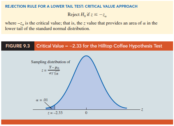 In the s known case, the sampling distribution for the test statistic z is a standard normal distribution. Therefore, the critical value is the value of the test statistic that corresponds to an area of a = .01 in the lower tail of a standard normal distribution. Using the standard normal probability table, we find that z = -2.33 provides an area of .01 in the lower tail (see Figure 9.3). Thus, if the sample results in a value of the test statistic that is less than or equal to -2.33, the corresponding p-value will be less than or equal to .01; in this case, we should reject the null hypothesis. Hence, for the Hilltop Coffee study the critical value rejection rule for a level of significance of .01 is
