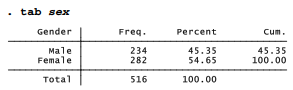 There are many ways to approach poststratification. (For an alternative to the by-hand approach shown below, Stata’s svyset command offers a poststrata option, illustrated in the Survey Reference Manual; type help svyset for the basic syntax.) If we know the true population percentages of key variables, as we do regarding gender, then weights to adjust for response bias can be calculated from population percentage divided by sample percentage. Sex is coded 0 for males, who make up 48.4% of the adult population of New Hampshire but only 45.35% of this sample. It is coded 1 for females, who are 51.6% of the population and 54.65% of the sample. There are no missing values of sex in these data.