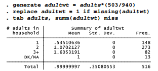 A single dataset might include weight variables calculated from more than one source, such as design weights and poststratification weights. To combine these into one overall weight variable, we multiply and then make an adjustment so that the final sum of weights equals the sample size. A quietly prefix before summarize tells Stata to calculate summary statistics but do not show us the results, to save time or space. The quietly prefix works similarly with other commands as well.