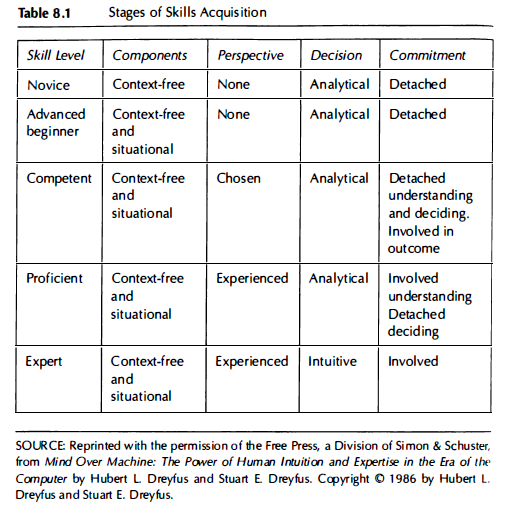 A competent practitioner has the ability to shift between context-free (for example, analytical) and contextual components in a particular intervention situation, but her or his involvement in the activity is limited to trying to influence the outcome. Finally, an expert bases professional activity on full involvement in the local situation and makes many suggestions on the basis of experientially informed intuitions about reasonable options drawn from previous work: “Intuition or know-how, as we understand it, is neither wild guessing nor supernatural inspiration, but the sort of ability we all use all the time as we go about our everyday task” (Dreyfus & Dreyfus, 1986, p. 29). Dreyfus and Dreyfus’s (1986) developmental schema is summarized in Table 8.1.