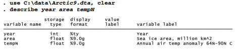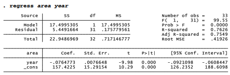 After any regression, the predict command can obtain not only predicted values, but also residuals and other post-estimation case statistics — statistics that have separate values for each observation in the data. Switching to a different example for this section, we will look at the simple regression of September Arctic sea ice area on year (using Arctic9.dta). A downward trend averaging -.076, or roughly 76,000 km2 per year, explains 75% of the variance in area over these years (1979-2011).