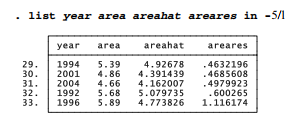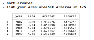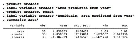 We can create a new variable named areahat, containing predicted values from this regression, and areares, containing residuals, through the post-regression command predict. Predicted values have the same mean as the original y variable. Residuals have a mean of zero (-1.38e-09 = -1.38*10-9 = 0). Note use of a wild-card symbol in the summarize command: area* means all variable names that begin with “area”.