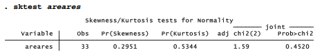 The predicted values and residuals can be analyzed like any other variables. For example, we can test residuals for normality to check on the normal-errors assumption. In this example, a skewness-kurtosis test (sktest) shows that the residuals distribution is not significantly different from normal (p = .45).