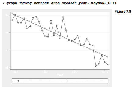 Graphing predicted values against year traces the regression line (Figure 7.9).