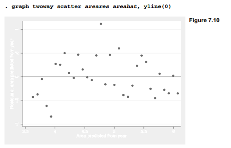 Ideally, residual versus predicted graphs show no pattern at all, like a swarm of bees that is denser in the middle (see texts such as Hamilton 1992a for good and bad examples). There is a pattern visible in Figure 7.10, however. Predictions are too high in the early years, resulting in mostly negative residuals; too low in the middle, resulting in mostly positive residuals; then too high toward the end, where residuals again turn negative. This is the same pattern noticed earlier when we sorted the residuals by size.