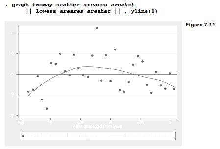 The up and down pattern of residuals becomes obvious in Figure 7.11 in which the residual versus predicted graph is overlaid by a lowess curve. Lowess (locally weighted scatterplot