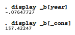 After any regression, Stata temporarily remembers coefficients and other details. Thus _b[varname] refers to the coefficient on independent variable varname. _b[_cons] refers to the coefficient on _cons (usually, the y-intercept).