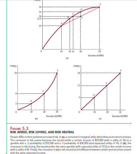 Figure 5.3 (a) applies to a woman who is risk averse. Suppose hypothetically that she can have either a certain income of $20,000, or a job yielding an income of $30,000 with probability .5 and an income of $10,000 with probability .5 (so that the expected income is also $20,000). As we saw, the expected utility of the uncertain income is 14—an average of the utility at point A(10) and the utility at E(18)—and is shown by F. Now we can compare the expected utility associated with the risky job to the utility generated if $20,000 were earned without risk. This latter utility level, 16, is given by D in Figure 5.3 (a). It is clearly greater than the expected utility of 14 associated with the risky job.