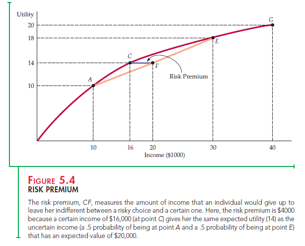 line AE (thus representing an average of $10,000 and $30,000). But the utility level of 14 can also be achieved if the woman has a certain income of $16,000, as shown by dropping a vertical line from point C. Thus, the risk premium of $4000, given by line segment CF, is the amount of expected income ($20,000 minus