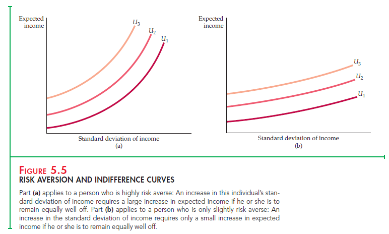 Figure 5.5 (a) describes an individual who is highly risk averse. Observe that in order to leave this person equally well off, an increase in the standard devia- tion of income requires a large increase in expected income. Figure 5.5 (b) applies to a slightly risk-averse person. In this case, a large increase in the standard deviation of income requires only a small increase in expected income.