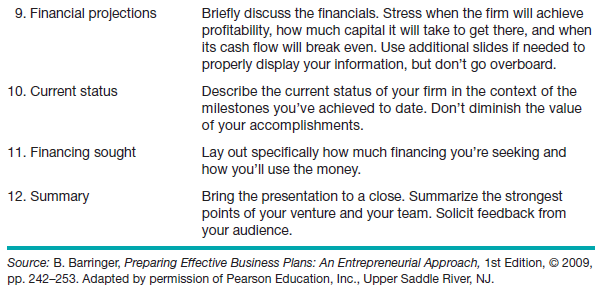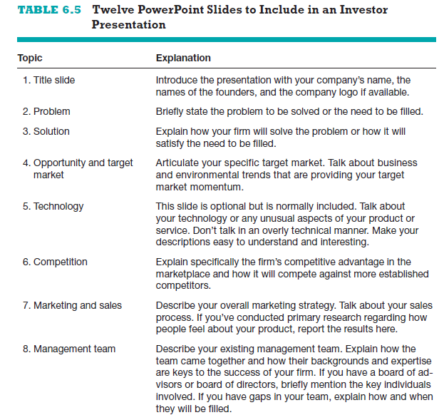 The entrepreneur should arrive at the appointment on time and be well prepared. If any audiovisual equipment is needed, the entrepreneur should be prepared to supply the equipment if the investor doesn’t have it. These arrangements should be made prior to the meeting. The presenta- tion should consist of plain talk and should avoid technical jargon. Start-up entrepreneurs may mistakenly spend too much time talking about the tech- nology that will go into a new product or service and not enough time talking about the business itself. The most important issues to cover in the presen- tation and how to present them are shown in Table 6.5. This presentation format calls for the use of 12 slides. A common mistake entrepreneurs make is to prepare too many slides and then try to rush through them during a 20-minute presentation.