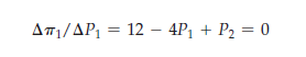 At what price P1 is this profit maximized? The answer depends on P2, which Firm 1 assumes to be fixed. However, whatever price Firm 2 is charging, Firm 1’s profit is maximized when the incremental profit from a very small increase in its own price is just zero. Taking P2 as fixed, Firm 1’s profit-maximizing price is therefore given by