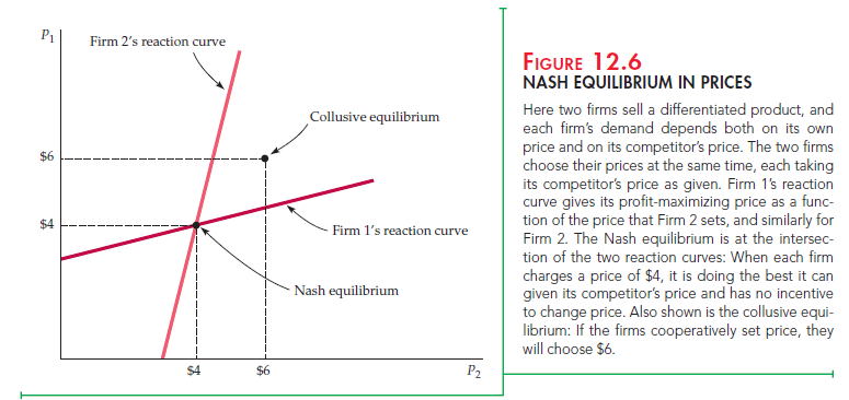 These reaction curves are drawn in Figure 12.6. The Nash equilibrium is at the point where the two reaction curves cross; you can verify that each firm is then charging a price of $4 and earning a profit of $12. At this point, because each firm is doing the best it can given the price its competitor has set, neither firm has an incentive to change its price.