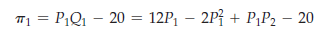CHOOSING PRICES We will assume that both firms set their prices at the same time and that each firm takes its competitor ’s price as fixed. We can therefore use the Nash equilibrium concept to determine the resulting prices. Let’s begin with Firm 1. Its profit p1 is its revenue P1Q1 less its fixed cost of $20. Substituting for Q1 from the demand curve of equation (12.5a), we have
