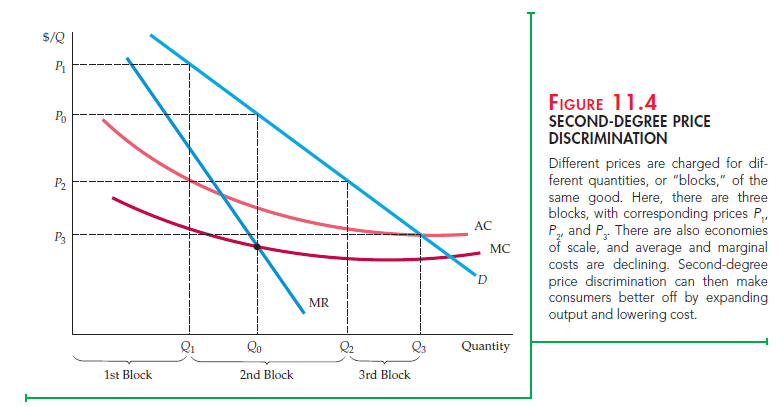 Figure 11.4 illustrates second-degree price discrimination for a firm with declining average and marginal costs. If a single price were charged, it would be P0, and the quantity produced would be Q0. Instead, three different prices are charged, based on the quantities purchased. The first block of sales is priced at P1, the second at P2, and the third at P3.